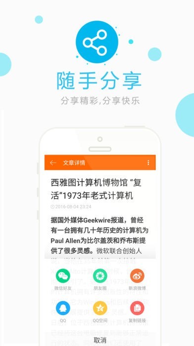 看到有意思的内容,直接通过“一键分享”功能分享给朋友吧。微博、朋友圈、QQ好友、短信甚至邮件,朋友在哪里,就能分享到哪里。