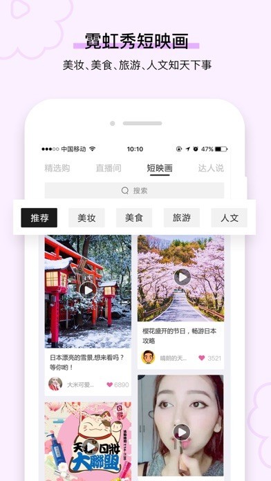 App Storeより引用霓虹秀は日本に関するグラフィック記事、短編ビデオと越境Eコーマスを組み合わせた最先端のアプリケーションです。中国や日本のKOLさんたちの豊かなブティック体験をシェアすることを見るもできます。素晴らしいショッピング体験と商品を確保するために、日本の実店舗ネットで直接購入して国際輸送することができます。