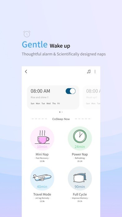 [Gentle Wake-ups] Our unique scientifically designed alarm rings for pain-free wakeups, as well as flexible settings for various napping needs.
