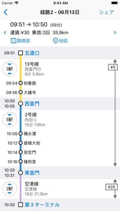 出発駅、到着駅、時間を選択すると、複数なルート、時間、距離、運賃情報を取得します。