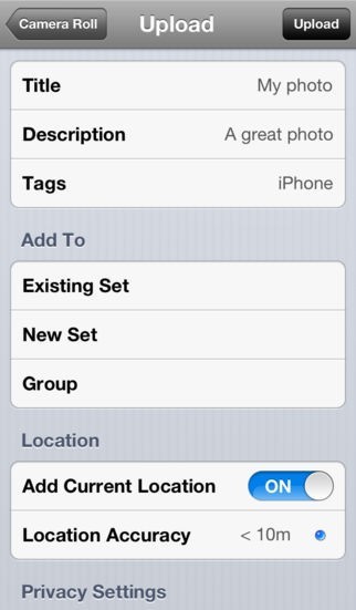 • Upload full resolution photos to Flickr, including background uploading and upload later, EXIF data and GPS location
