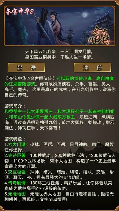 App Storeより引用【夺宝中华2-金古群侠传】可以玩的武侠小说,高自由度的江湖冒险游戏。
