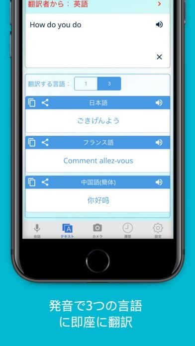 App Storeより引用Multi Translate is a professional translator and interpreter app able to translate any language into 3 others at the same time (you can select any 3 languages from 100+).
