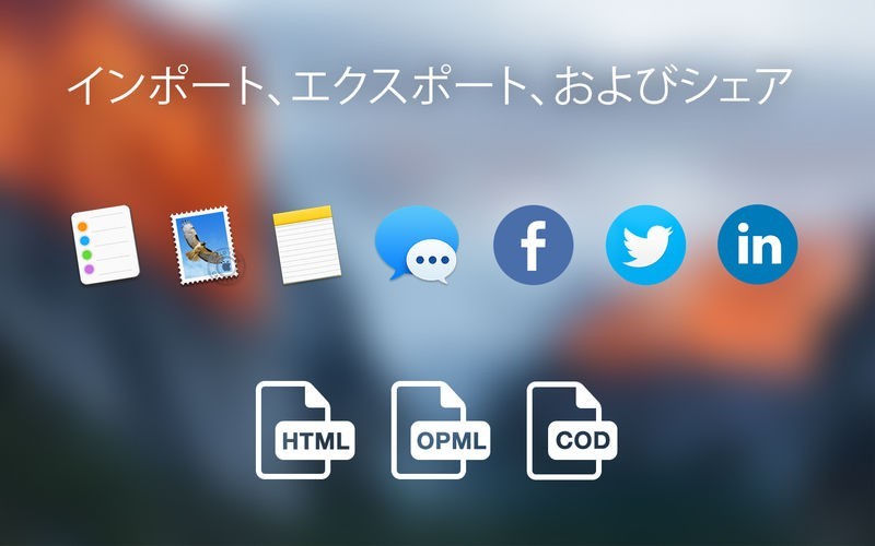 • アウトラインをリマインダー、ノート、メール、メッセージで共有する、Twitter、Facebook、LinkedIn