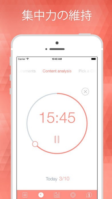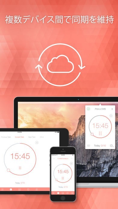App Storeより引用タスクを続けることは、画面に束縛されている私たちのような世代には非常に難しいことです。Be Focusedは、個人のタスクを短い休憩で分割し、身元を隠した複数の個人の間で分担作業することによって処理します。これは、作業に対するやる気と集中力を保持するために驚くほど効率てな方法です。タスクの作成、休憩時間の設定や一日、一週間あるいは指定期間中の進捗状況の追跡を行います。iPhone、iPadまたはMacのどれを使用されている場合でも、ご使用のデバイスを常に同期してご利用いただけます。