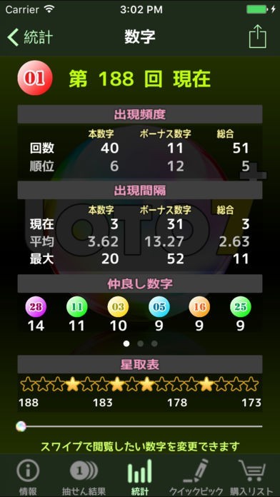 思いつきや占いのようにインスピレーションで選ぶのではなく、しっかりとしたデータからロト7のナンバーを選びたい、と考えている方にお薦めなのがこのアプリです。統計データを様々な切り口で提供してくれます。“根拠のある”ナンバーなら納得して購入できます。