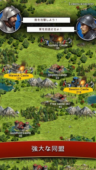 中世をイメージさせる世界観の中で、与えられたお城と兵士を元手に国力を上げ、兵士や設備を育てて自分だけの理想の国を育て、近隣の国との勢力争いでドキドキのバトルも楽しめます。