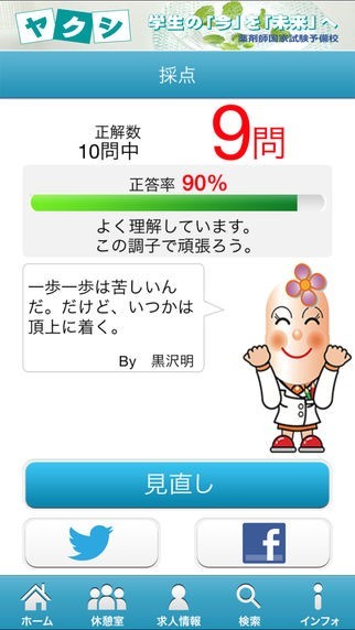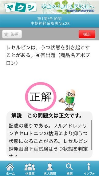 予備校が作成した薬剤師国家試験対策アプリであり、通学中や就寝前などの空き時間を利用して勉強することが出来ます。問題はジャンル別に分けられており、連続、ランダム、間違えた問題、苦手登録した問題の中から出題方法を選択することが出来ます。間違えた問題や苦手な問題を集中的に学習することが出来るので苦手分野の克服に有効です。問題はすべて○×の2択となっており、解答後は詳しい解説が表示されます。中には長い解説もありますがフリック操作で全文を確認できます。指定の問題を解いた後は採点ボタンと見直しボタンが表示され、見直しボタンを押すことで間違えた問題の復習が出来ます。