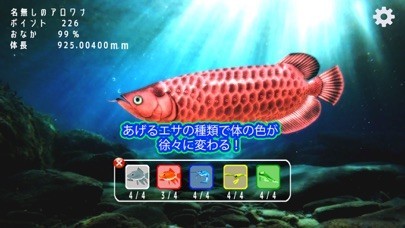 アロワナは餌を与えると勢いよく食べてくれ、それを見るのが楽しいのですが、その餌は自分で集めなければいけません。集める方法は簡単で、餌捕り画面で画面をなぞるだけで完了です。時間経過で無限に湧いてくるので沢山集められます。所持しきれなくなった餌はショップで使えるポイントに換金されます。ショップでは水槽を充実させる様々なものと交換が出来るため、餌集めも楽しく行えます。