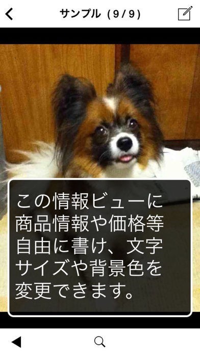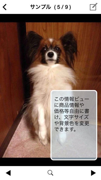 まずは編集モードで、写真や画像を選んで情報バーの部分にカタログに挿入したい文章を入力していきます。編集が終わったら閲覧モードでカタログの作成完了イメージをプレビューすることができます。