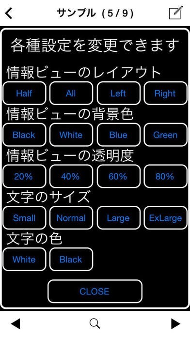 必要に応じて文字サイズは4種類や文字色は2色から選ぶことができます。また、文章が挿入される部分の情報バーも、配置や背景色、透明度などをそれぞれ4種類から選択することができます。