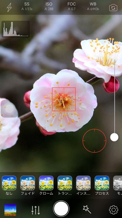 一眼カメラのパラメータ設定にひけをとらず、ISO感度・露出時間・露出補正・焦点距離・ホワイトバランスなどを正確に調整できます。