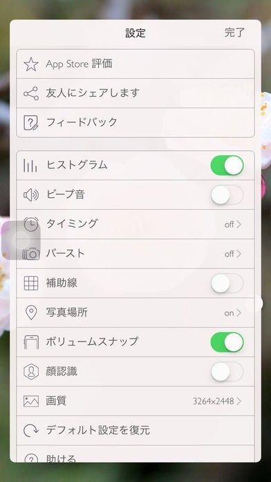 定時撮影・連写・位置情報・顔認識・画像品質・ヒストグラム・シャッター音量ボタンなどの機能がより使いやすい