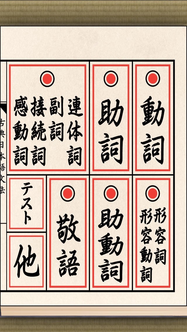 古典日本語の文法を学習するためのアプリです。日本古典文学で最もよく出てくる文法を体系化し、動詞・形容詞・助詞・助動詞・連体詞・敬語のカテゴリに分け、その活用や使い分けなどもわかりやすい表に整理しました。意外につまずく助動詞の接続・間違いやすい敬語の用法をやっと気持ちよく学習することができます。練習には『枕草子』や『徒然草』などの古典文学冒頭部分のほか、知識のレベルを確認するため400問以上のテストもあります。