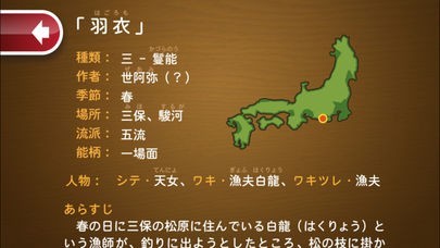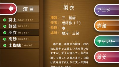 App Storeより引用ようこそ!能の世界へ。このアプリがあれば、ユネスコ世界無形文化遺産である能楽を誰でも、気軽に、すぐその場で楽しむことができます!能の演目はアニメーションでわかりやすく解説され、能をすぐに理解することができます。開演前の5分間、このアニメーションを見れば誰でも能を楽しめます!