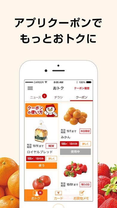 このアプリでは、新聞を購読するような必要なく近くの店舗のチラシを閲覧することが出来るようになります。ズームして拡大して情報を見ることが出来ますので、細かな情報でも見逃すことはありません。さらには、クーポンを利用することで、商品が安くなるのではなく商品にたくさんのポイントがつくようになります。またポイントは一般的に購入した場合にもポイントが得られるので、お得ですし、ポイントカードを持ち運んでお財布が重くなるといったこともなくなります。さらに割り引きの日を記録してわすれないようにすることも出来ます。