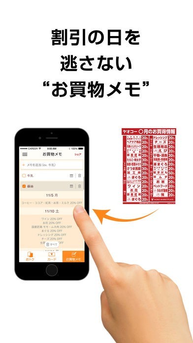 お買い物メモは、ショッピングリストをメモして管理することができる機能です。"お買い得情報カレンダー"から、お得にショッピングできる日や商品リストを確認して、日付をつけてメモを管理することができるため、お得に買い物できるチャンスを逃しません。