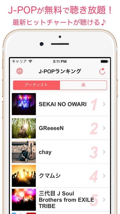 最新ヒット曲のアーティストがランキングで表示されるよ。そしてアーティストを選ぶと、そのアーティストの曲が表示されるよ!