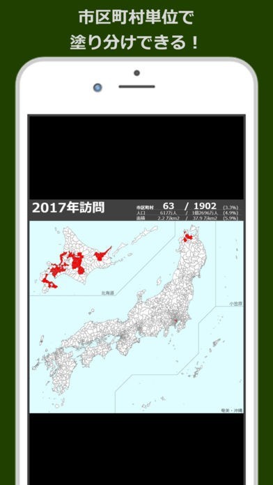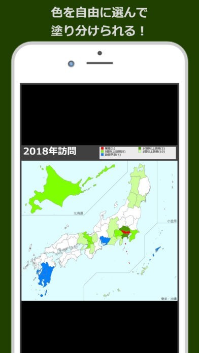 エリアごとに色を変えることができ旅行回数や時期を記録できる