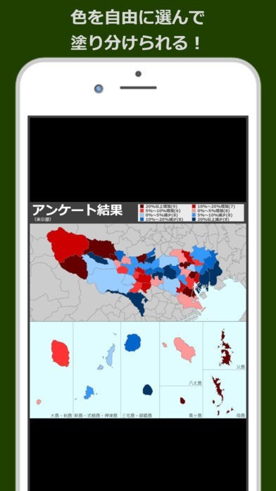 このアプリは、自分が訪れた県を塗りつぶすという目的だけでなく、たとえばある統計データを都道府県ごとに計測して、数値ごとに色を分けて塗りつぶすことで、データを反映したマップを作ることもできます。