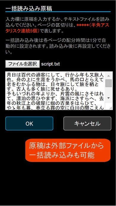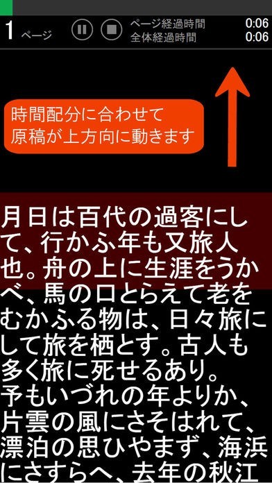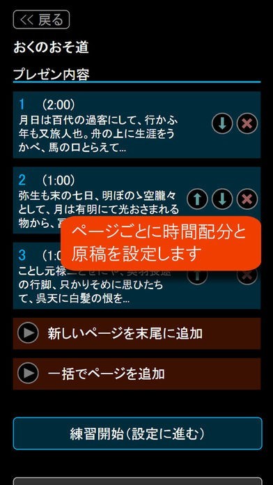 ページごとに、そのページに使う時間と原稿を設定し、配分された時間内で原稿が流れるように表示されていきます。