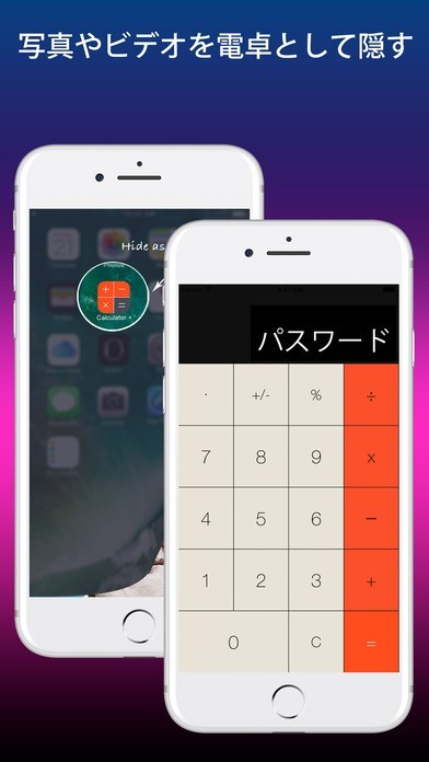 電卓風の隠しフォルダに他人に見せたくない画像や動画をまとめて保存出来るようになっています。データにパスワードを設定する事が可能なので、セキュリティーを高めたい時に役立つでしょう。
