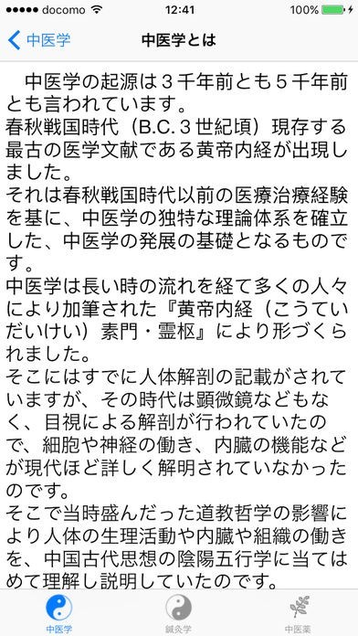 中国医学を専門的な知識に基づき、誰でもわかりやすいように解説しています。中国医学の起源は3千年以上とも言われ、現代でも西洋医学と混ざり合う形で引き継がれています。その深い知識を基礎から学ぶことに適したアプリです。