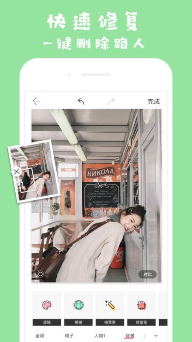 假期出去旅游,心爱的照片里撞进了一个陌生人,完全不用担心,你可以任性的把这个路人一键删除,马卡龙甚至会帮你智能修复背景,神奇般的立即还原景物