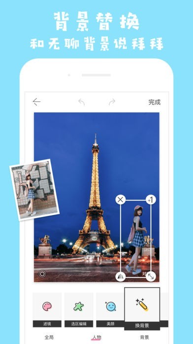 自动抠出人像后,你可以将背景随意替换,瞬间快闪到巴黎铁塔、好莱坞、北京故宫。不只是这样,换上动态背景,一键置身魔幻空间,再配首音乐,照片秒变朋友圈最潮视频