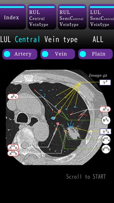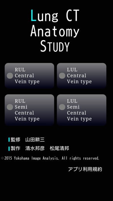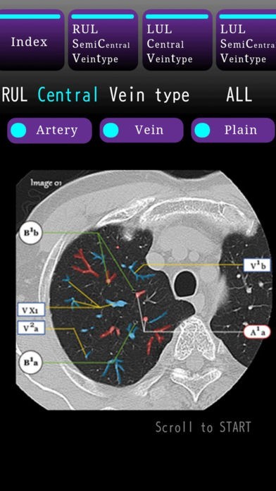 App Storeより引用上肺野のCTをCentral Vein typeとSemi Central Vein typeに区別し、気管支・動脈・静脈の走行を学習します。All , Arter,Vein,Plainを観察することができます。CT画像はスクロールで前後し、臨床のViewerと同様に視線を変えずにArteryやVeinの走行を学習できます。