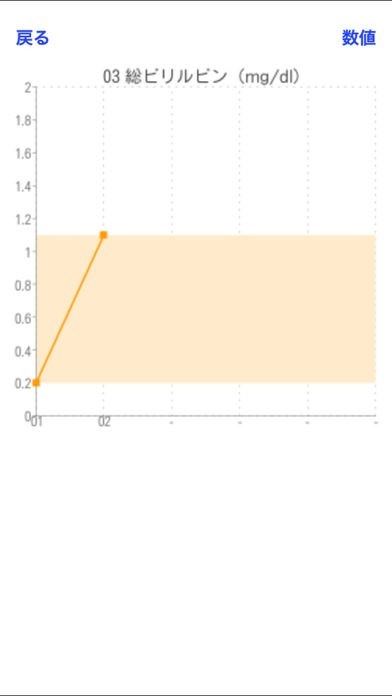 アプリ中のグラフ化機能を使えば、今までのデータは折れ線グラフで確認可能になります。また、各項目の基準値、正常範囲はグラフ中に網掛けで表示される為、一目で基準値との差を確認することが可能です。
