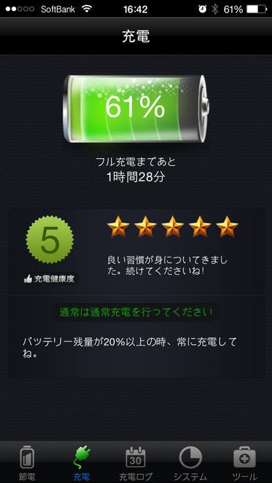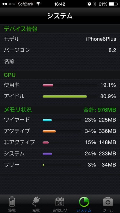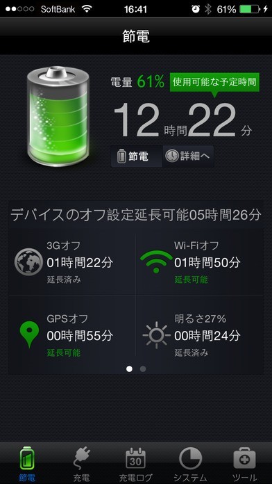 ランキングで上位にもなった「バッテリーマニア」を使うと現在の電量と、「使用可能な予定時間」を表示してくれます。 よって、それを見て、充電したほうがいいか、あとどれくらい使うことが出来るかの判断に使えて、場合によっては最低限の仕様に抑えようなどという判断を下すのに役立ちます。 さらには充電の種類も「急速充電」、「追加充電」、「トリクル」の中から選べるので、状況に応じたベストのものを使えます。 他には、「システム」で、デバイス情報、CPU使用率、メモリ状況など細かなデータを把握できるので、余裕を持って使用できているかなどを知れます。