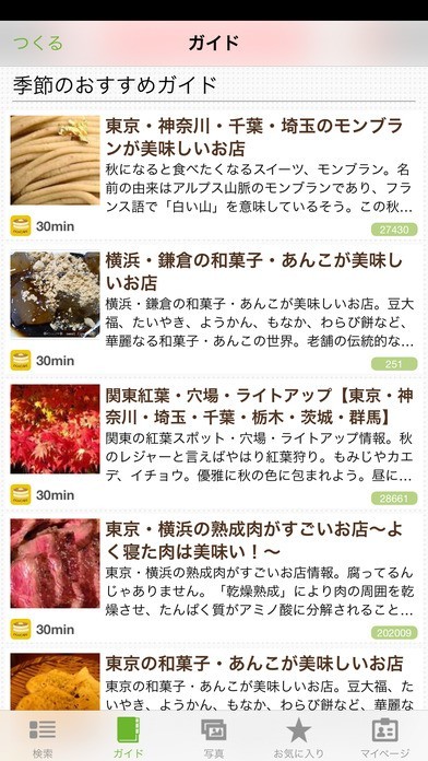 「おでかけランチ検索 30min」は、出先でグルメスポットやイベント情報を探し出せるアプリです。GPS機能が搭載されているので、現在地周辺にある人気のグルメスポットを紹介してくれます。ガイド機能も搭載されており「美味しいスイーツが食べられるお店」などの記事があるので、気になるものをタップすると読むことができます。また自分だけのガイドを作ることも可能なので、旅行先で行ったお店をまとめておいて日記のように記してもいいです。