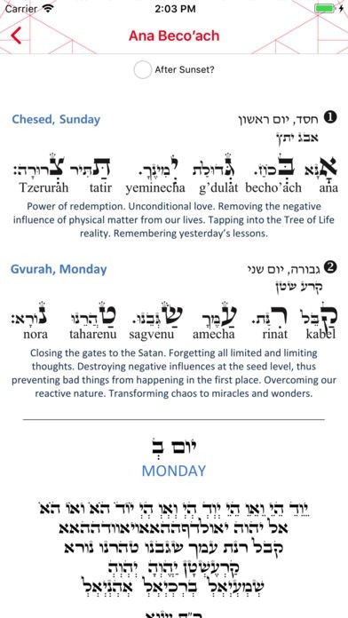 • Automatic Ana Be’koach – Ana Be’koach customized for you with the Angels of the Day and Tikkun Ha’nefesh automatically appear in the correct location based on day and month
