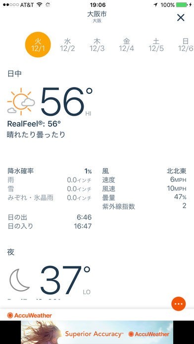 「AccuWeather - Weather for Life」は、天気予報に加えて気圧や風速などの詳細な情報もチェックすることができるアプリになります。任意の場所を複数登録しておいて天気予報をまとめて一覧表示することができるようになっているので、職場や自宅などの情報を一気にチェックすることができます。