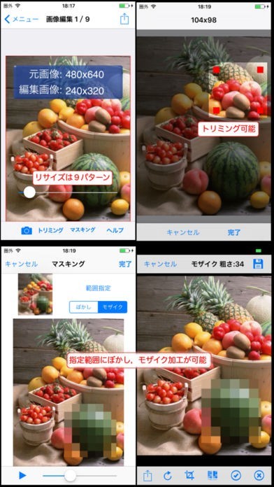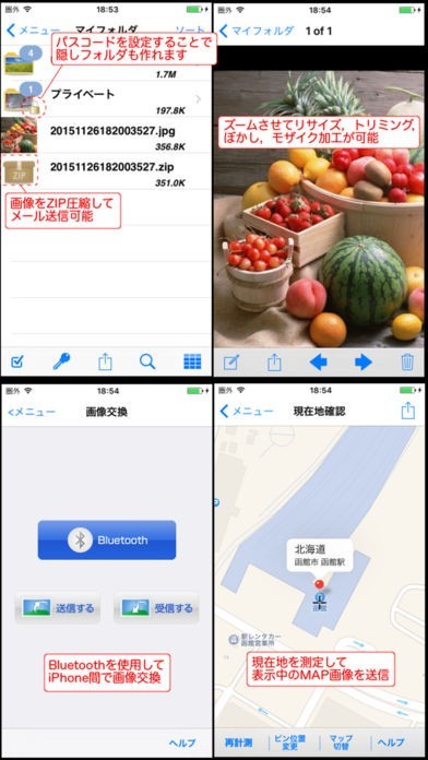 マイフォルダ機能で画像を管理してトリミングを行ったり、データを圧縮・解凍したり、メールで送信したりSNSに投稿したり、iPhone間でBluetoothを使って画像交換できます。また、パスワードを設定した秘密の隠しフォルダで他人に見られたくない画像をコッソリ管理できます。