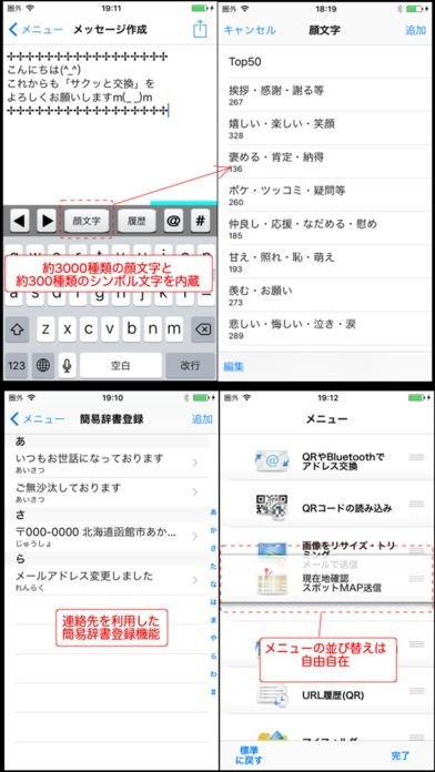 顔文字や特殊なシンボル文字を使って簡単に可愛いメッセージ文章を作成することができるメッセージ作成機能が搭載されています。収録されている顔文字3000とシンボル文字300種類を自由に使用できます。