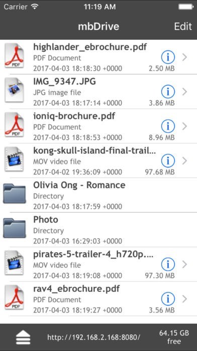 「mbDrive」に保存されているドキュメントおよびメディアファイルは、アプリ内で閲覧することが可能です。Microsoft OfficeドキュメントやPDFファイル、動画・画像ファイルの他、Safari WebアーカイブやiWorkドキュメントなど、多様な形式に対応しています。