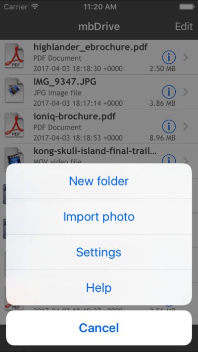 データの転送だけでなく、新しいフォルダの作成やファイルの削除、カット・コピー&ペーストでの移動などの操作を行うことができます。また、カメラロールとの写真のインポート・エクスポートが可能です。