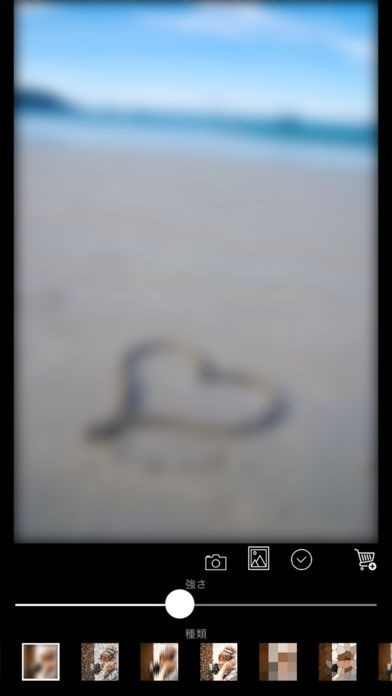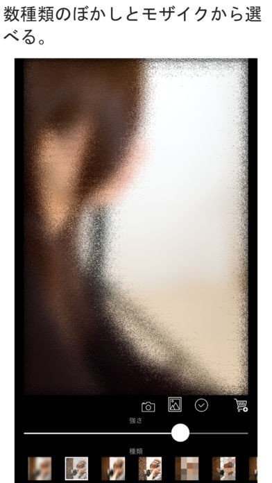 写真をぼかしたりモザイクにするのもワンタップ。気軽に加工が楽しめる