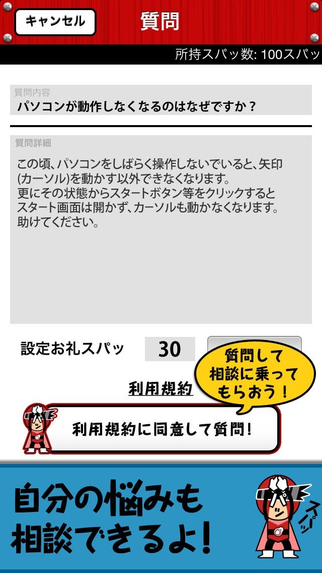 タイトルと、詳しい内容、そして正しく回答してもらった時のお礼ポイントを指定して登録しましょう。