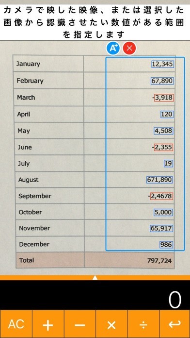 認識成功時に表示されるA+のボタンを押すと、範囲内にある認識した数字の合計値を表示します。