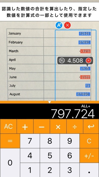 認識に成功した数値にタップをすると、その文字から吹き出しが表示されます。吹き出し内の+/-ボタンをタップすると、正の数の場合は負の数に負の数の場合は正の数に逆転させます。