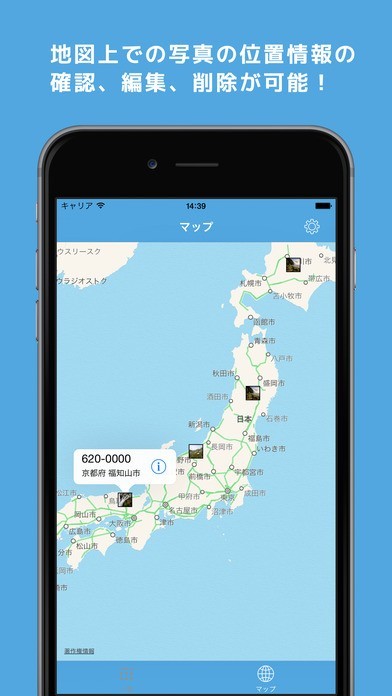 Photo Info! - 写真の位置情報(GPS/EXIF)の編集、削除、確認は、スマートフォン上の写真のGPSによるマップデータの確認や編集、削除が可能でインターネットにアップロードする際に知られたくない位置情報などを削除して安全にアップロードしたいという時に便利です。また、データをもとに地域別の旅行アルバムなどにまとめることも可能です。また、マップデータのない写真は追加することも可能で、写真の整理の際に便利です。EXIFデータの確認は撮影時のカメラの撮影日時や明るさや感度などの情報が表示されるため、写真が上達したいというときには役に立つ情報で、写真を楽しみたい、アップロードして楽しみたいという方には役に立つ機能が搭載されています。