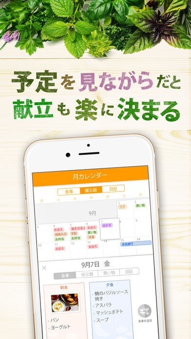 カレンダーで、朝昼晩の献立を記録でき、一緒に料理の写真も保存できるアプリ