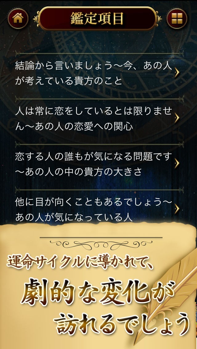 このアプリでは、あの人が考えているあなたのことや、あの人以外の二つ目の可能性、二人がどのようにして恋に落ちるのか、最後の可能性などについてジョンヘイズの占いを体験することができます。