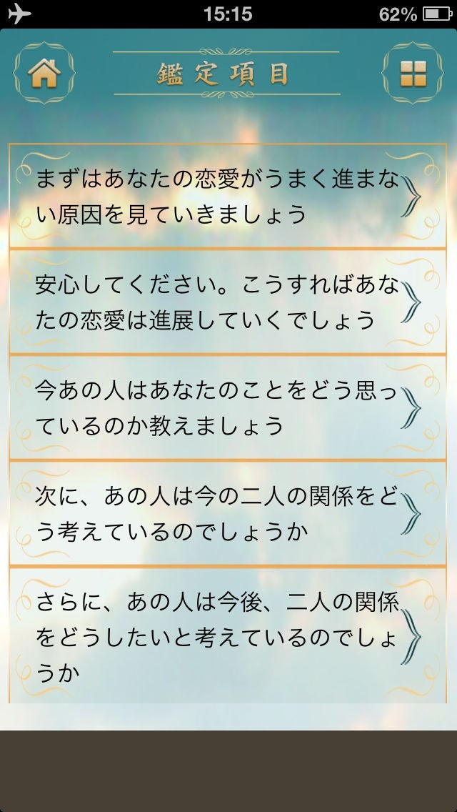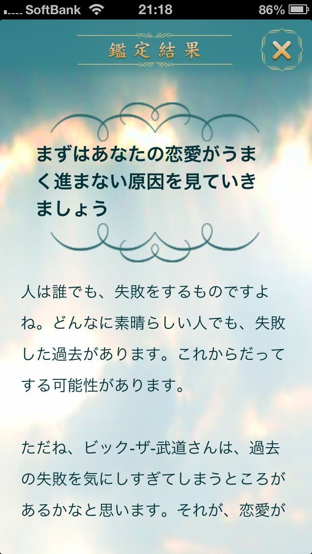 このアプリは「あなたの過去」という項目を答えた後、その後も項目を答える事で二人の未来が分かり運命をより良いものにすることができる占いを行います。私と彼or彼女と結ばれたいと思ったのであれば、このアプリは運命の人をより近い存在に変化させてくれるのです。