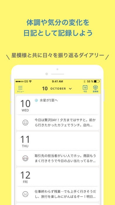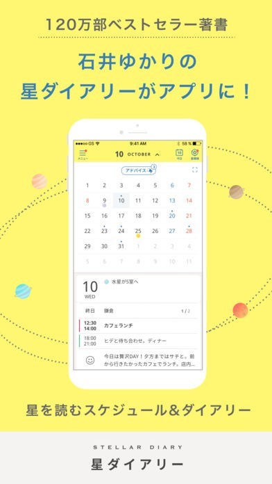 星ダイアリーは、月や星の動きや新月満月の日をカレンダー表示します。スケジュールを見ながら今日の占いが読め、予定を明るくこなせます。12星座占いをいつでも確認できて便利です。