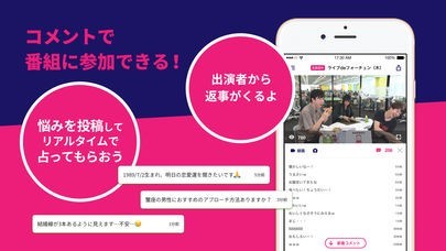 お笑い芸人とアイドル、人気の占い師が共演して占いをテーマにしたオリジナル制作番組を毎日配信してくれるTVアプリです。いつでも好きなときに番組を視聴することができます。