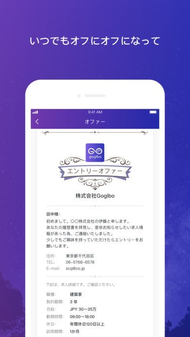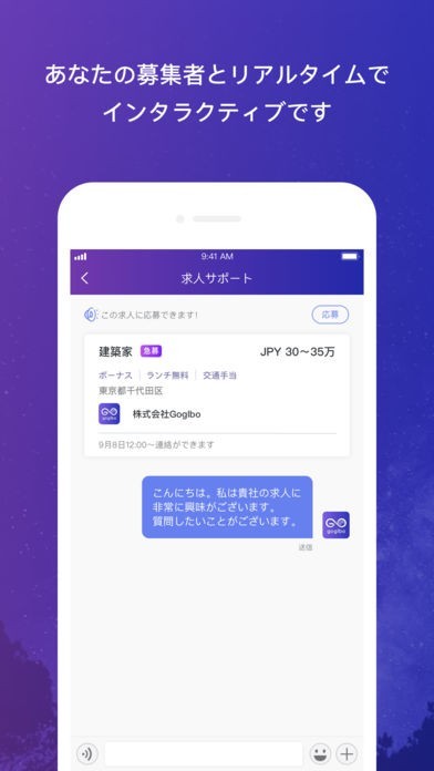 Goglboは最新のグローバル職種を検索、自動マッチング、アプリ上でのチャットや面接設定が携帯ひとつですべて行うことができます。